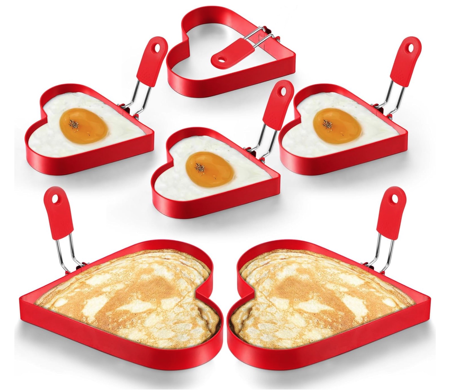 Patelai 6 Pcs Heart Pancake Mold Fried Heart Shape Fried Egg Ring Set Stainless Steel Pancake Molds with Silicone Handle for Christmas Gifts Cooking Breakfast Omelette Sandwich Red 4 Inch 6 Inch